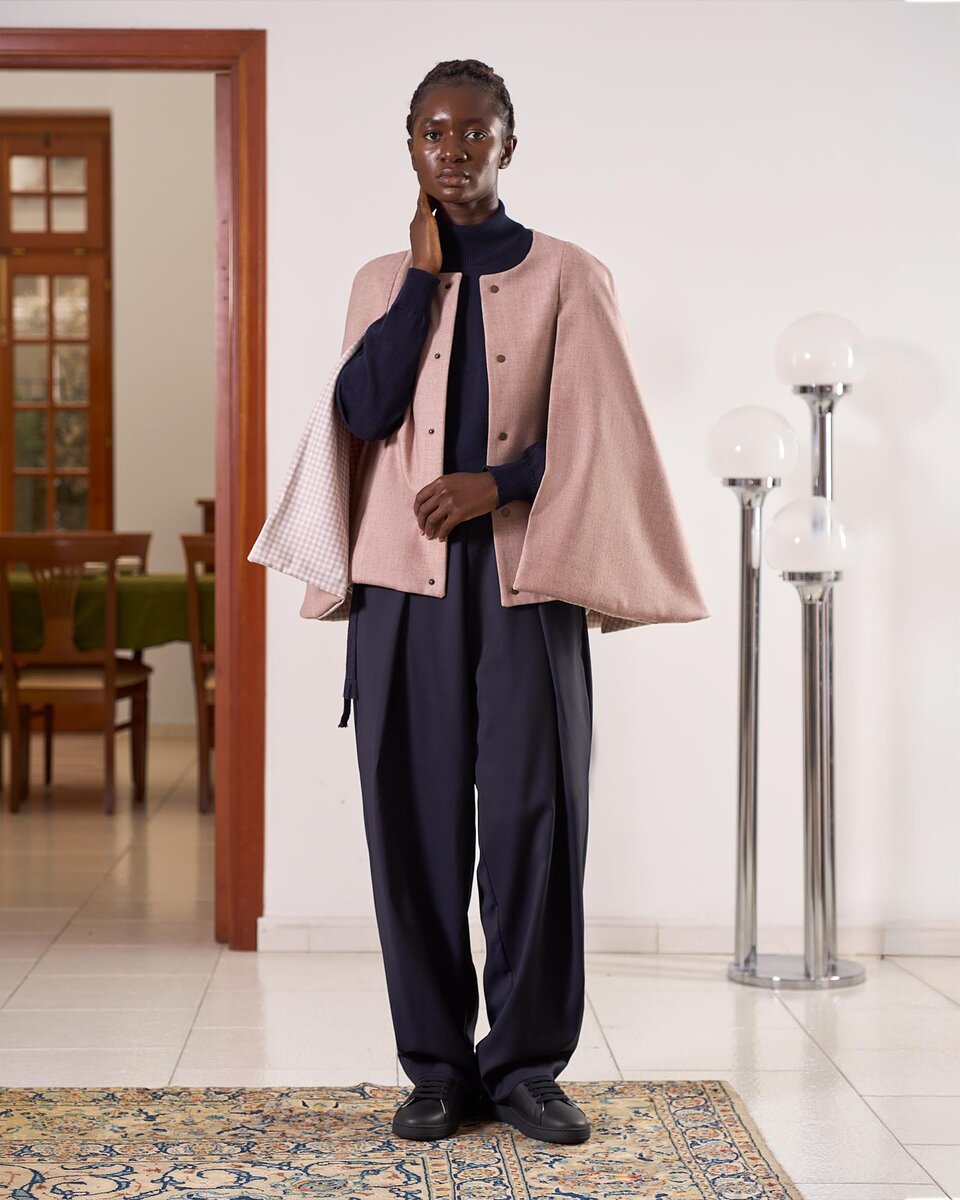 The cape jacket closes as it falls over the shoulders. Its original cut combines the advantages of a classic straight jacket with the style of a cape.