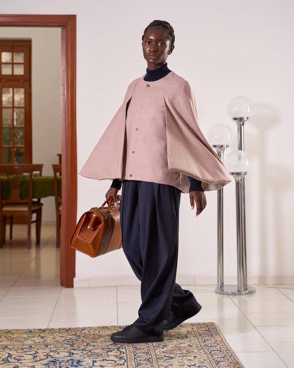 La veste cape se ferme comme elle se pose sur les épaules. Sa coupe originale associe les avantages de la veste droite classique au style de la cape.