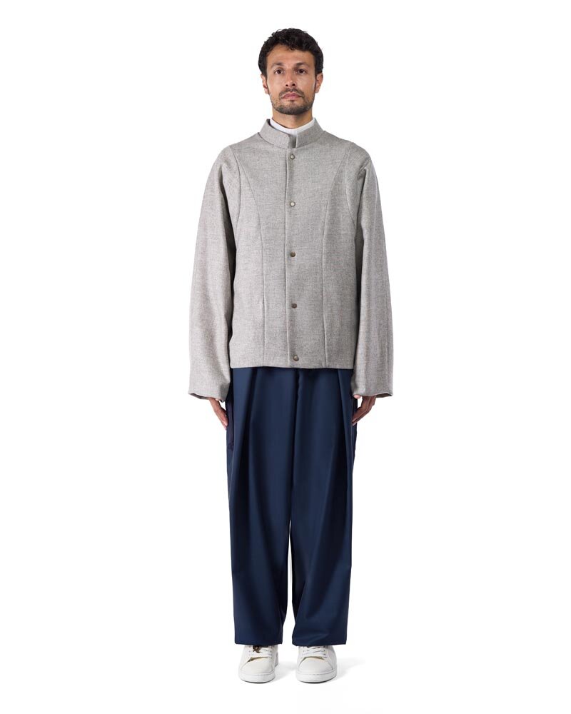 Pensée pour le voyage, la veste ovo réalisée en laine ou lin et coton associe la légèreté et la chaleur de la fibre naturelle. Sa coupe rigoureuse est une traduction architecturale du tracé net formé par la brisure dans la glace d'un glacier alpin. Cette pièce est l'expression d'un luxe suisse qui concentre toute la valeur dans la matière et la pureté de la forme.